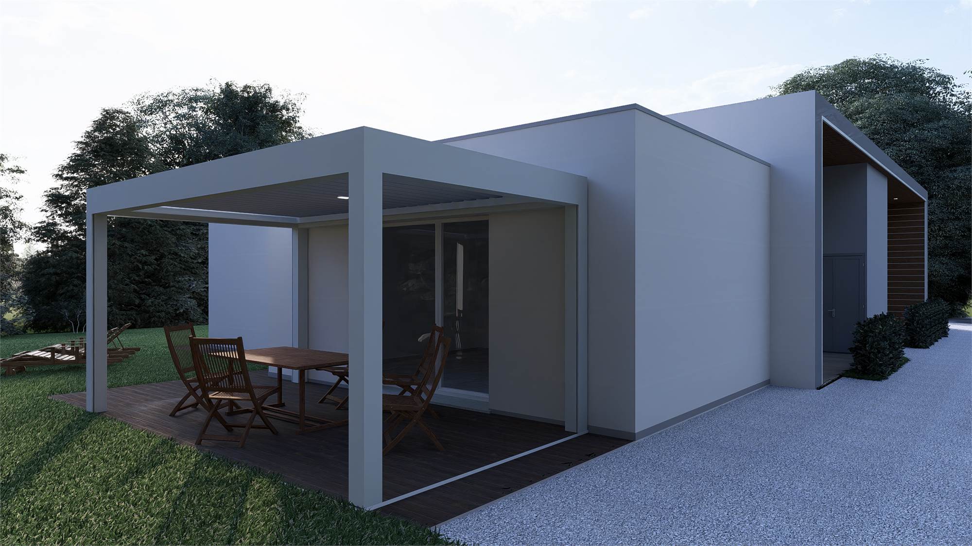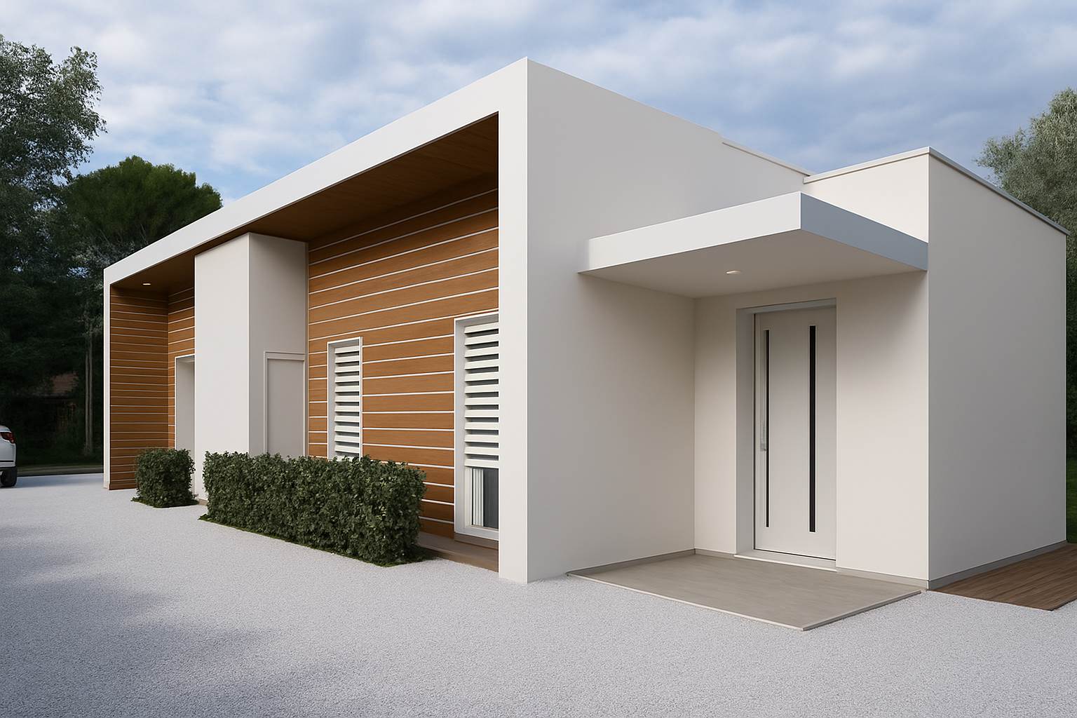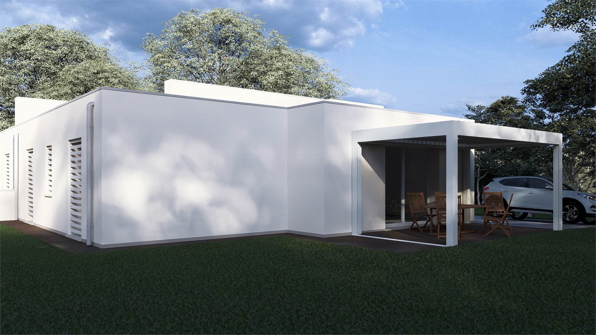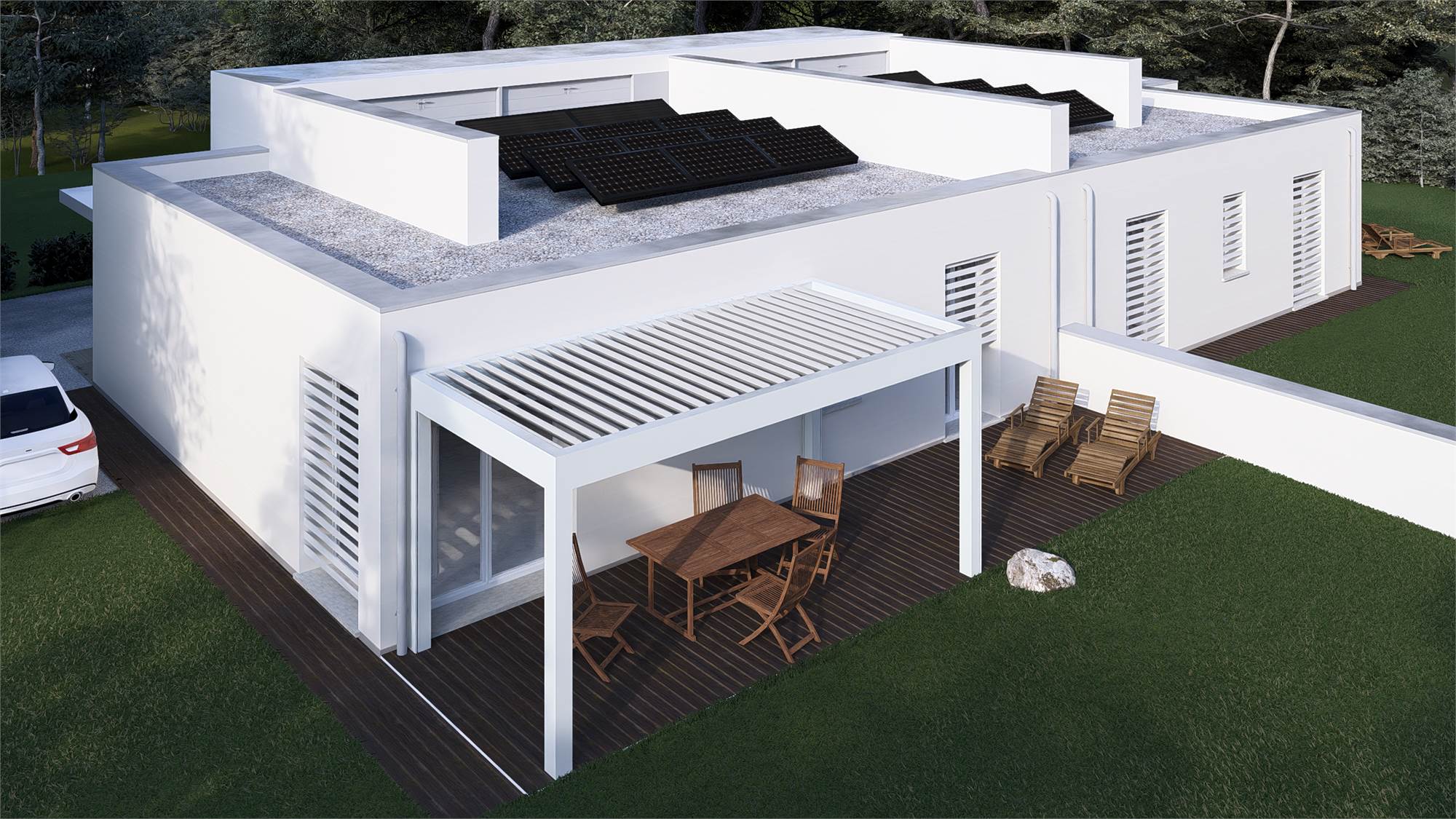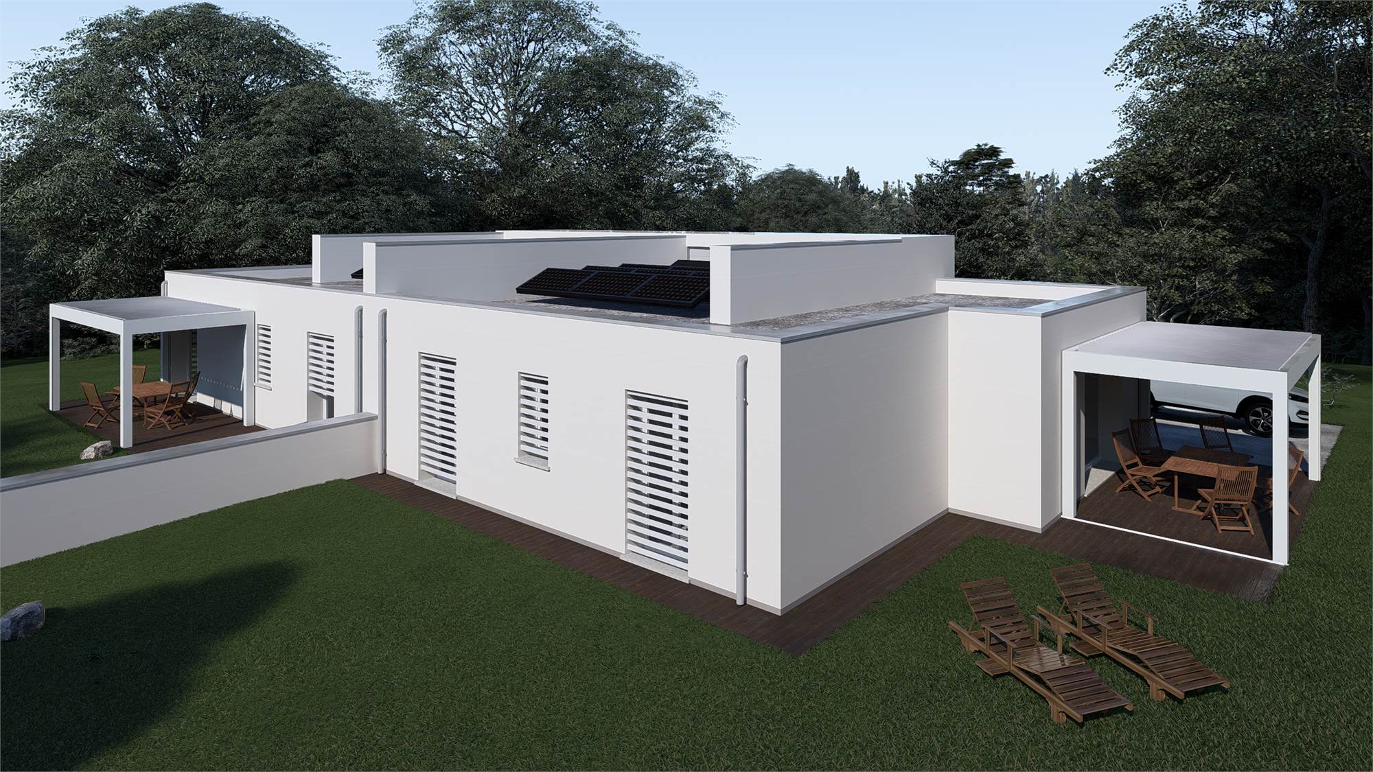 La scelta progettuale di una casa monolivello con tetto piano è stata adottata non solo per motivi estetici , poiché la copertura piana dona all’edificio un aspetto moderno e contemporaneo , ma anche per ragioni tecniche e ambientali : consente infatti di facilitare l’installazione e quindi la manutenzione degli impianti fotovoltaici e termici migliorando noi l’efficienza energetica dell’edificio . Inoltre in questo modo l’intera area potrebbe essere utilizzata per diverse attività pratiche e ricreative , quali area relax , giardino pensile , spazio giochi per bambini ; inoltre in futuro potrà facilmente consentire la soprelevazione dell edificio senza dover ricorrere a demolizioni improprie delle falde di copertura .