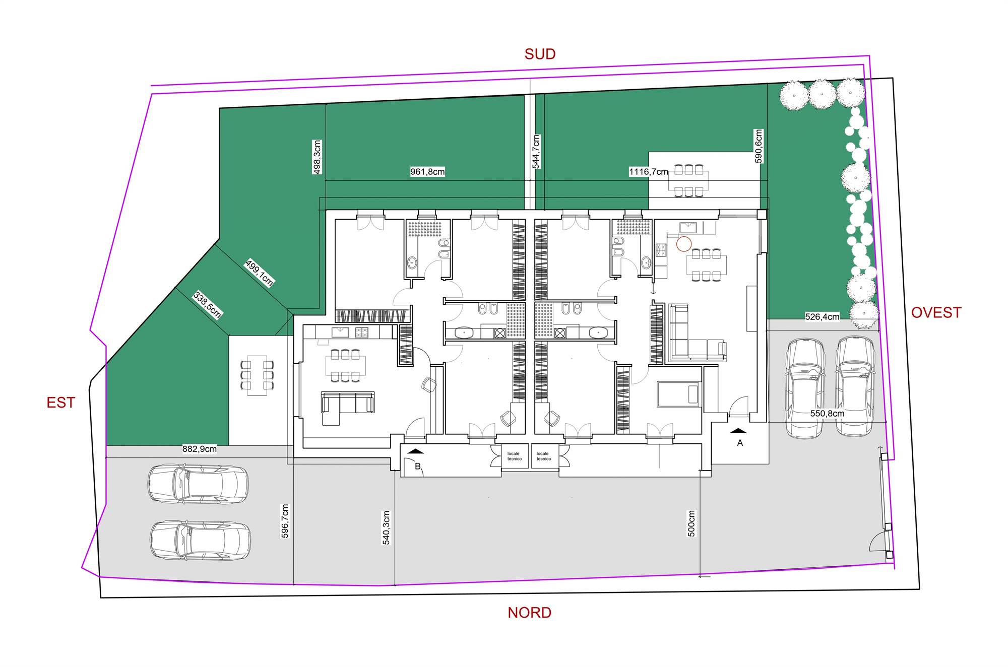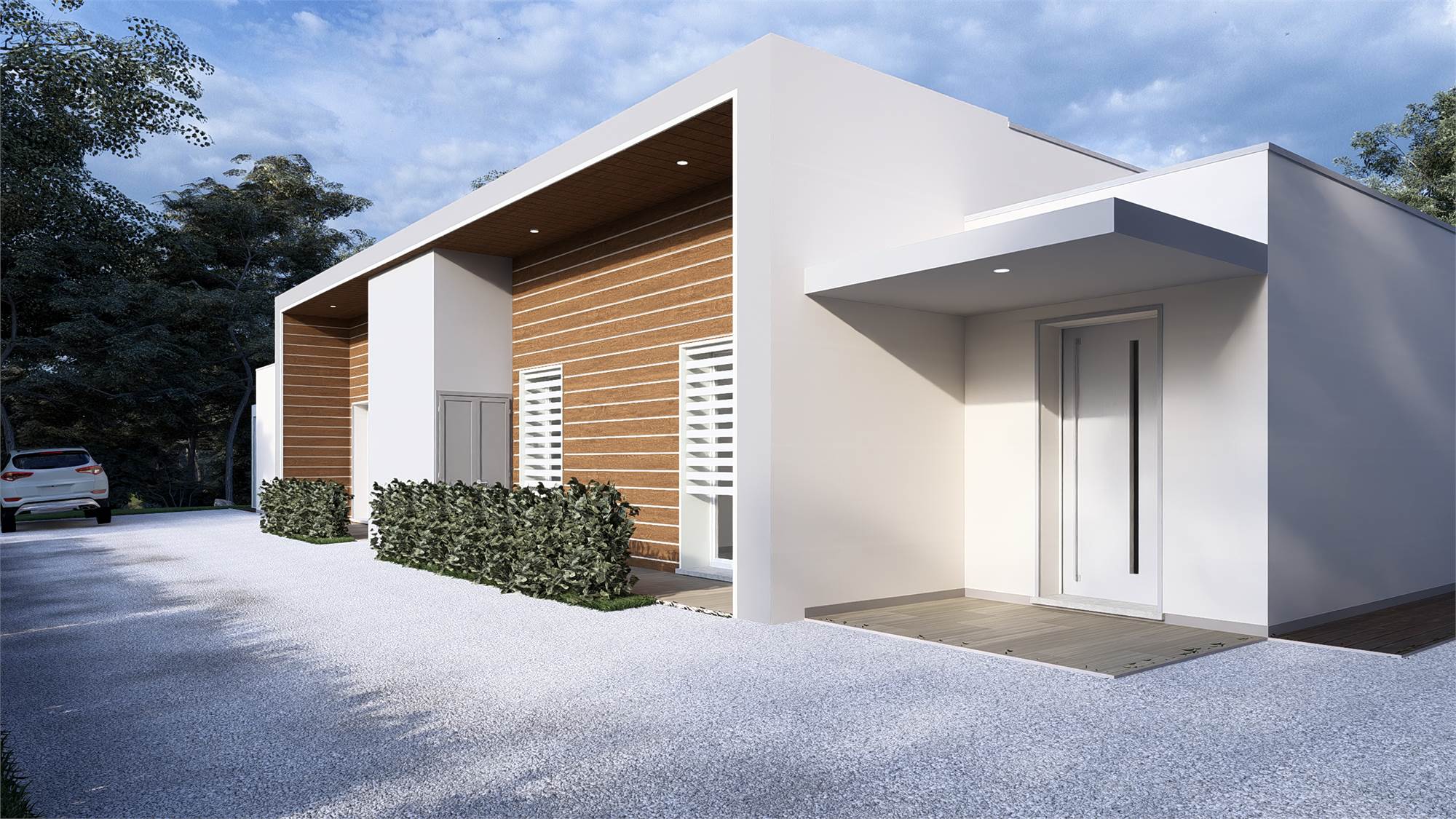 Il progetto prevede la realizzazione di una casa bifamiliare su un unico piano con copertura piana , ingressi indipendenti ,giardini privati e assenza di barriere architettoniche .